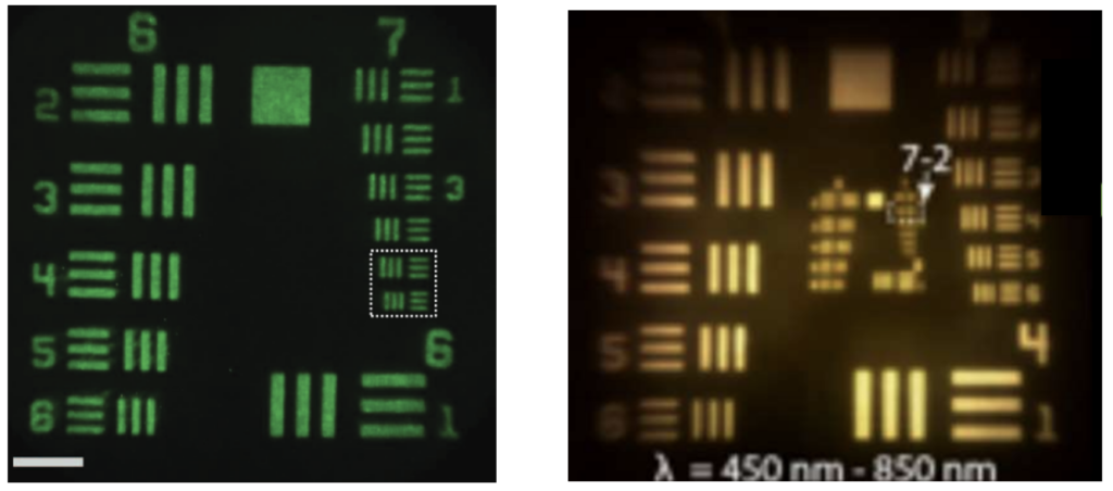 例如,下图展示了传统 DOE 与超透镜作为成像透镜时的成像效果。超透镜可提供更均匀的成像,而传统 DOE 在图像边缘强度明显下降,产生暗角(vignetting)。