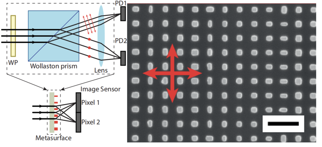 下图展示了一个概念:超透镜将水平偏振光与垂直偏振光分别聚焦到不同的光电探测器上,并给出了这种偏振选择性超透镜的纳米柱排布示意图。