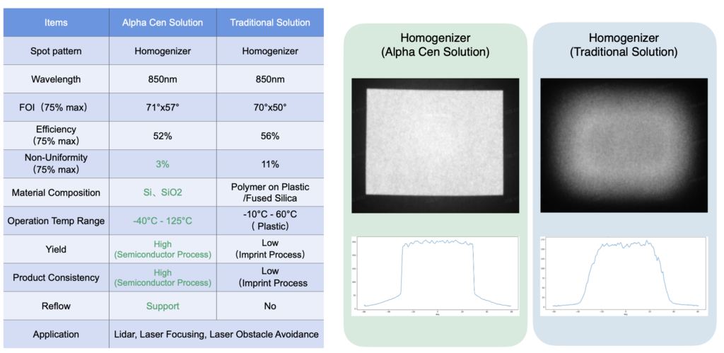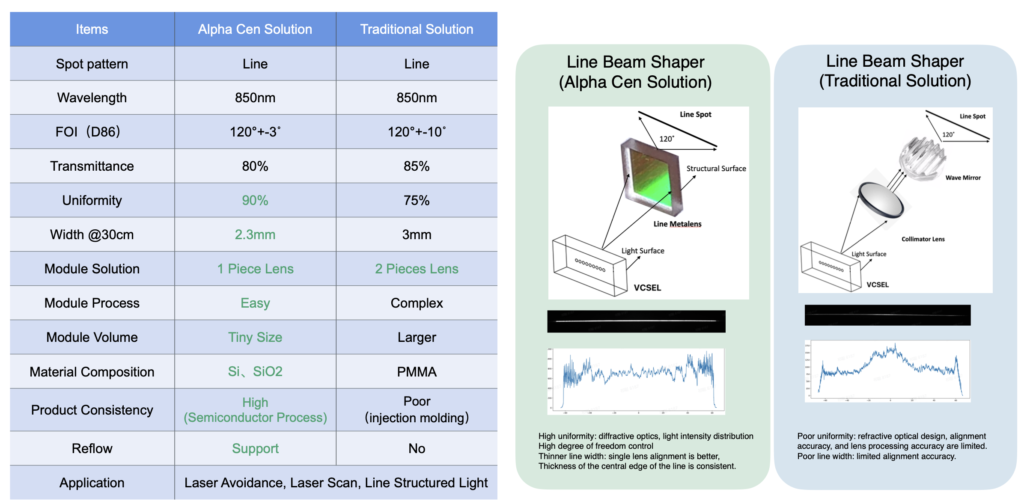 得益于严格的生产迭代与对制造误差的紧密控制,Alpha Cen 的线形整形、点阵投影与均匀化超透镜可将 0 级能量控制在 2% 以下,从而确保性能稳定一致,并符合设计预期。