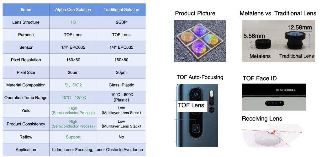 Alpha Cen 已开发用于 ToF(Time-of-Flight)成像的近红外超透镜,可相较传统镜头组显著降低模组高度——从 12.6 mm 降至 5.6 mm。下图对比了采用超透镜方案与采用折射镜头方案的 ToF 成像模组。