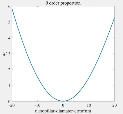 下图展示了在不考虑其他制造误差的前提下,940 nm 超透镜中 0 级能量占比与纳米柱直径误差之间的关系。如图所示,直径偏差 15 nm 就可能导致 3% 的 0 级能量占比,这对多数光束整形应用而言是不可接受的。