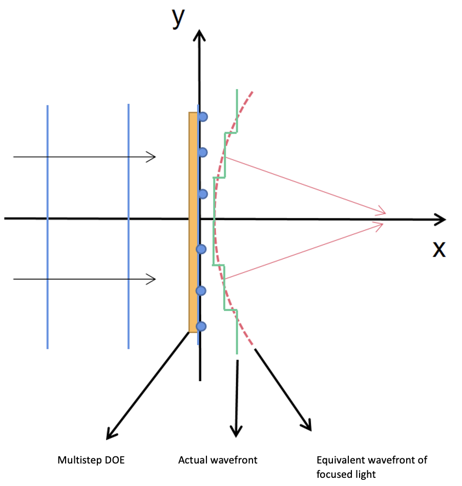 多级台阶 DOE 的效率会随着台阶数量的增加而提升。这是因为理想波前总是平滑且连续的,但实际的多级台阶 DOE 只能产生 N 个离散相位级。因此,光通过多级台阶 DOE 后(图 5 中绿色实线所示),其相位只能近似理想的平滑波前(图 5 中红色虚线所示)。高度级数越多,对理想连续相位的逼近越好,从而效率越高。