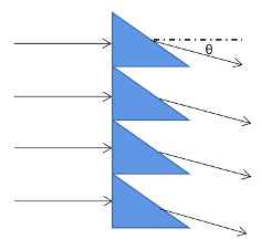 传统 DOE 存在遮挡(shadowing)效应,从而导致角带宽较窄。遮挡效应不仅存在于多级台阶 DOE,也存在于锯齿型 DOE。图 6 展示了一个用于闪耀光栅功能的锯齿型传统 DOE。由于遮挡效应,其理论衍射效率上限会随着光栅出射角 θ 的增大而降低。