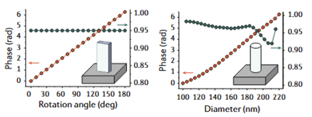 纳米柱的旋转角或几何尺寸需要被合理设计,以对所需的 2π 相位变化进行离散采样,这一点与 DOE 通过不同高度台阶来实现离散相位类似。下图中的红色曲线表示 PB 相位/透射相位与旋转角或纳米柱直径之间的关系,绿色曲线表示纳米结构的透射率。无论采用哪种相位调制方式,超透镜的微/纳结构都具有统一的高度,因此消除了传统 DOE 中存在的遮挡效应(shadowing effect)。